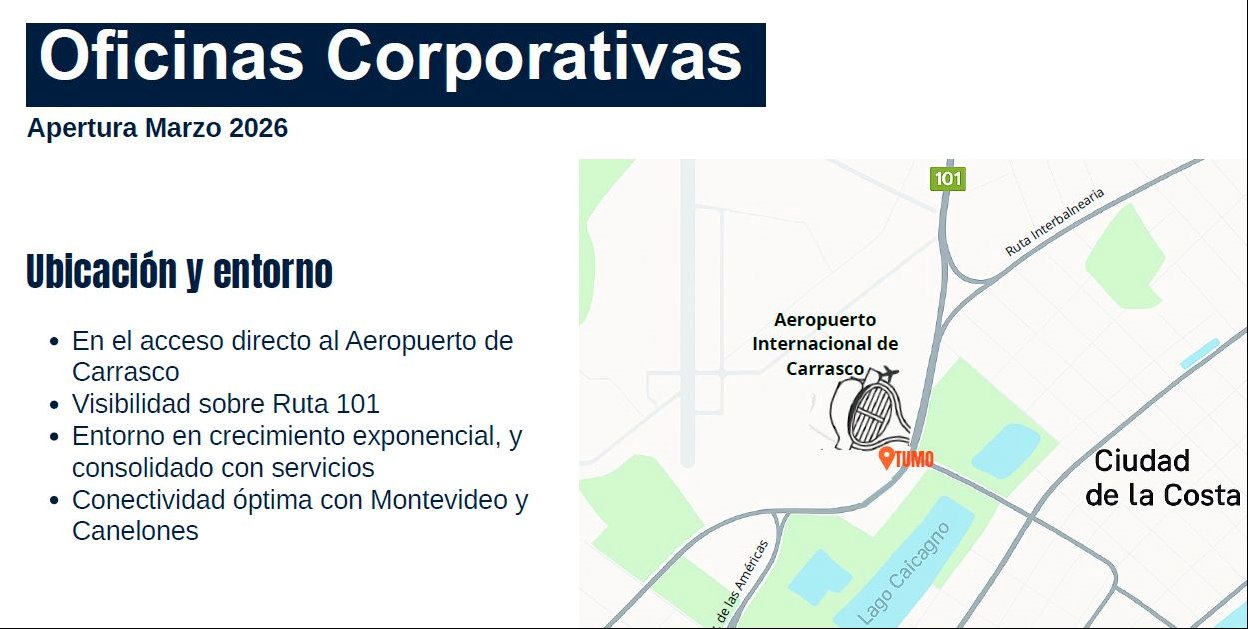 Oficina en inmejorable ubicación; ubicado en el ingreso al Aeropuerto de Carrasco (Ruta 101), este proyecto integra un centro educativo de tecnología creativa para jóvenes (TUMO) y un espacio de OFICINAS CORPORATIVAS. Es una iniciativa con alto impacto social y una propuesta de valor única para empresas que buscan instalarse en un entorno innovador, accesible y con sinergia directa con el aeropuerto.