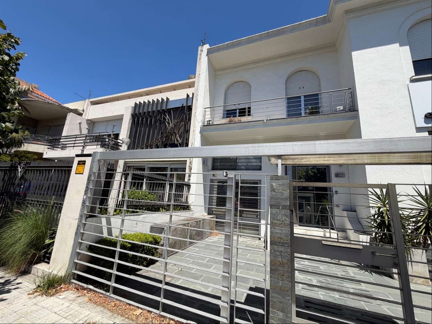 Jardín al frente con reja perimetral y portón automatizado, entrada de garaje.