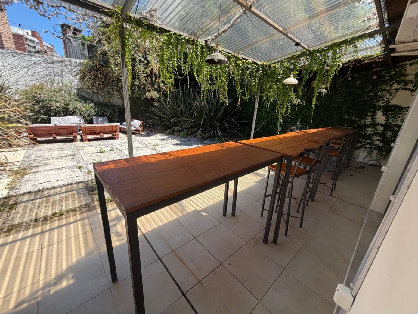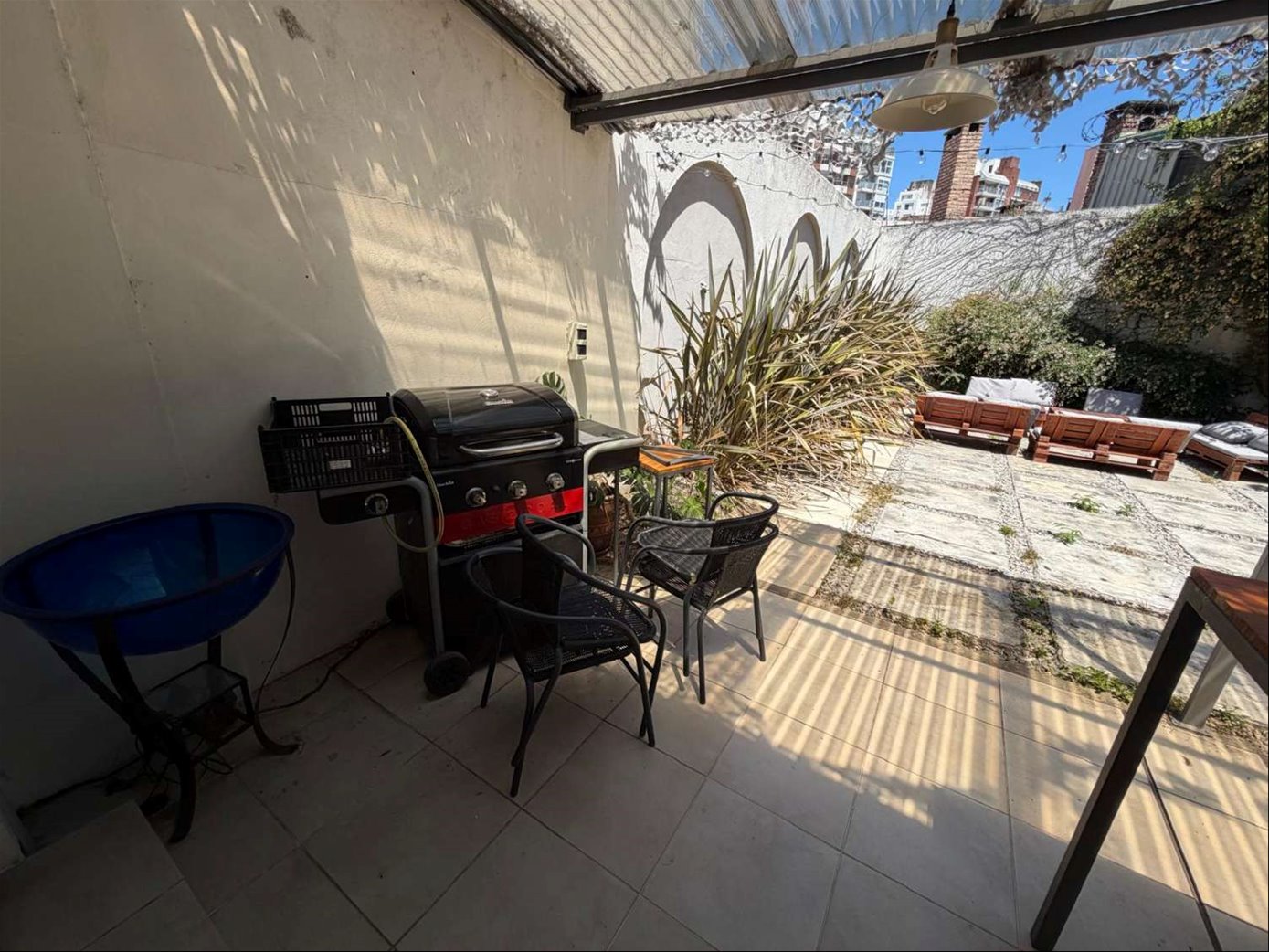 Patio interior. Salida a fondo enjardinado y embaldosado.